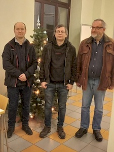 ![]() Robert Wetzel, Edwin Fischer, Wolfgang Beyer (v.l.n.r). 9 Schachfreunde, darunter die Top-3 des Vorjahres, ließen sich das nicht entgehen und sammelten in den jeweils nur 8 Partien schon wieder reichlich Wertungspunkte. Die meisten davon, nämlich gleich 13 Stück, holte sich zum Auftakt Edwin Fischer vom SV Eiche Reichenbrand, der sich mit 7,5 Punkten knapp vor dem letztjährigen Turniersieger Robert Wetzel (Grün-Weiß Niederwiesa, 7,0 Punkte) durchsetzte. Entscheidende Bedeutung fiel dabei dem Sieg Fischers im direkten Duell gegen Wetzel zu, ansonsten gelang es nur Wolfgang Beyer, mit dem Remis gegen Fischer in die Phalanx beider einzudringen. 5,5 Punkten und Rang 3 standen der „Eiche” am Ende zu Buche, die im Schlussspurt noch Thilo Bocklisch (USG Chemnitz, 5,0 Punkte) vom Podest verdrängte. Ulrich Wünsch (USG) verpasste dieses gleichfalls nur um 0,5 Zähler. Er gewann zwar gegen Beyer, unterlag jedoch Bocklisch. Die vergleichsweise geringe Teilnehmerzahl brachte immerhin mit sich, dass niemand leer ausging und selbst dem Letztplatzierten noch (4) WP gutgeschrieben wurden. Das zweite der wiederum 12 Monatsturniere ist für Donnerstag, den 6. Februar angesetzt. |
