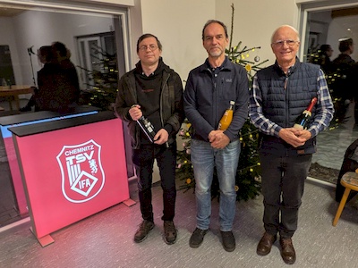 ![]() Thilo Müller, Thomas Gritz, Christian Tiedt (v.l.n.r.). Beide Spieler starteten souverän ins Turnier und gewannen ihre ersten drei Partien überzeugend. Traditionell gab es nach der dritten Runde im Dezember eine Pizza zur Stärkung - zugleich ein Dankeschön für ein tolles und ereignisreiches Turnierjahr 2025. In der vierten Runde musste sich Thilo Müller jedoch dem starken Nachwuchstalent Daniel Stiehler aus Wilkau-Haßlau geschlagen geben. War das bereits die Vorentscheidung? Noch nicht ganz, denn auch Thomas Gritz kam in dieser Runde nicht über ein Remis hinaus. Damit war klar: In der letzten Runde musste er gewinnen, um sich Platz 1 sicher zu sichern. Dies gelang ihm mit einem Sieg gegen Daniel Stiehler, womit Thomas Gritz den Turniersieg und zugleich die Gesamtwertung vor Thilo Müller erringen konnte. Platz 3 in der Gesamtwertung belegte Christian Tiedt aus Frohburg. Die SG Limbach-Oberfrohna gratuliert den Gesamtsiegern herzlich! Damit geht ein weiteres spannendes Schnellschachjahr in Limbach-Oberfrohna zu Ende. Die SG Limbach-Oberfrohna bedankt sich herzlich bei allen Teilnehmerinnen und Teilnehmern für die stets freundliche, sportlich faire Atmosphäre. Besonders erfreulich war auch in diesem Jahr die hohe Teilnehmerzahl - ganz gleich ob Anfänger oder erfahrener Schach-spieler. Die Ausschreibung für das neue Jahr folgt zeitnah. Die SG Limbach-Oberfrohna freut sich schon jetzt über weitere neue Teilnehmerinnen und Teilnehmer. |