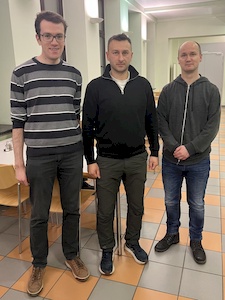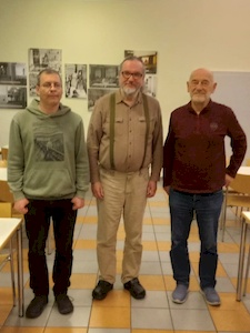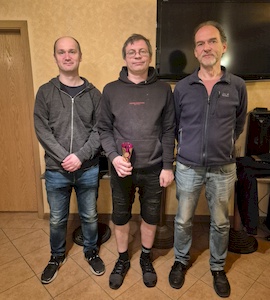 ![]() Edwin Fischer, Kay Kempe, Alexander Knorr (v.l.n.r.). Kay Kempe konnte in der 2. Runde mit dem Sieg gegen Edwin Fischer den Sieg des Turnieres sichern. Eine Überraschung konnte Frank Buschmann in der ersten Runde mit dem Gewinn gegen den viertplatzierten der Blitzserie, Wolfgang Beyer, erzielen. Der jüngste Teilnehmer Julius Finck von Aue konnte sich mit 2 Siegen gleich nach den 5 stärksten Teilnehmern platzieren. Das nächste Turnier der Blitz-Grand-Prix-Serie des CSV findet am 06.03.2025 bei der USG Chemnitz, Mensa TU Straße der Nationen 62, 09111 Chemnitz statt (Meldeschluss 18:45, Beginn 19:00 Uhr). |