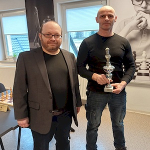 ![]() Chemnitzer Stadtmeister 2025 Markus Gößler. Damit schaffte der 32-Jährige von der USG Chemnitz als erst fünfter Spieler die Titelverteidigung. Zuvor war das nur Gerd Lorenz insgesamt achtmal (!) sowie je einmal Alfredo de la Cruz, Matthias Hörr und zuletzt (2016) Stanislav Azimov gelungen. Überdies holte Gößler nicht nur den 2. Sieg bei seiner 2. Teilnahme, er ist zudem in allen OCSM-Spielen nach wie vor ungeschlagen! Fischer musste sich demnach wie schon im Vorjahr mit Rang 2 begnügen, während Martin Kapp mit dem abschließenden Sieg gegen Joshua Li und 6,5 Punkten noch vorbei am punktgleichen Hörr aufs Treppchen sprang. Bester Jugendlicher wurde Lorenz Mehner, während Volkmar Brand als Bester Senior aus dem Turnier hervorging. Beide sammelten im Turnierverlauf je 5,5 Punkte. 40 Teilnehmer aus 16 Vereinen waren im November letzten Jahres in dieses Turnier gestartet, das als Chemnitzer Stadtmeisterschaft inzwischen seit 1978 (!) ausgetragen wird - und als OCSM2526 ab Herbst diesen Jahres sehr gerne wieder...! |