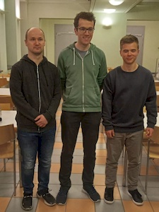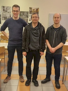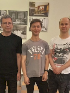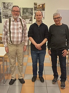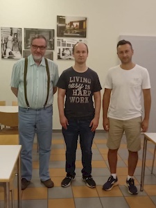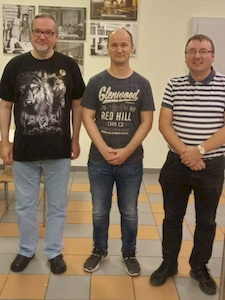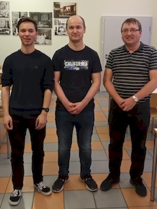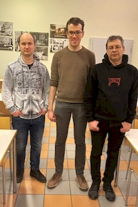 ![]() Markus Gößler, Ruslan Nuiyev, Robert Wetzel (v.l.n.r). 10 Teilnehmer hatten sich zum 2. Monatsturnier des Jahres eingefunden, darunter zum 2. Mal u.a. auch Wetzel, weshalb er die zugegebenermaßen noch wenig aussagekräftige Gesamtwertung mit 21 Wertungspunkten (WP) anführt. Platz 2 und 3 dieser Jahreswertung belegen mit 17 bzw. 16 WP Beyer und Ulrich Wünsch, bevor die zwei Monatssieger Edwin Fischer und Nuriyev mit jeweils 13 WP folgen. Das 3. Monatsturnier wird gemeinsam mit dem 6. Turnier der Chemnitzer Blitz-Grand-Prix-Serie ausgetragen, also wie im März letzten Jahres wieder mit doppelter Wertung. Nach bisher 5 Runden führt in diesem Wettbewerb derzeit Fischer mit 82 Punkten die Gesamtwertung deutlich an. Ihm folgen Wetzel (62 Punkte), Kay Kempe (44) und Beyer (36) auf den Plätzen 2 bis 4. Turnierbeginn am 6. März ist 19.00 Uhr, der Meldeschluss wie üblich 18.45 Uhr. |