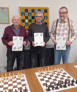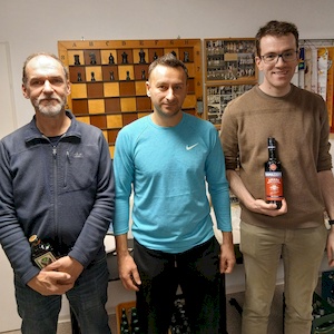 ![]() Prof. Heinz Gläser, Stanislav Azimov, Wolfgang Beyer (v.l.n.r.). Um den Turniersieg mussten drei gleich starke Gegner kämpfen. Stanislav Azimov von der USG Chemnitz konnte seiner Favoritenrolle mit 5 Siegen gerecht werden. Prof. Dr. Heinz Gläser vom TSV IFA Chemnitz musste nur gegen Stanislav einen Punkt abgeben. Den 3. Platz sicherte sich dann Wolfgang Beyer vom SV Eiche Reichenbrand. Das Turnier fand wie immer in einer ruhigen und fairen Atmosphäre statt. Ich würde mich über eine bessere Beteiligung im Jahr 2026 freuen und bitte alle Schachfreunde, mir Anregungen oder Wünsche für das kommende Jahr mitzuteilen. |