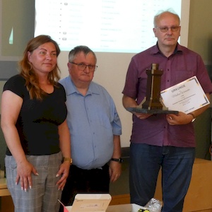 ![]() Katja Opitz (Vereinskoordinatorin der Stadt Glauchau) und André Martin (Präsident des Glauchauer SC 1873 und des SVS) überreichen den „Roten Turm” anTurniersieger GM Mathias Womacka (v.l.n.r.).
