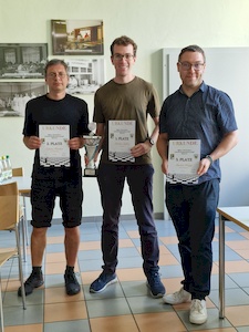 ![]() Im Juni auf dem Podest: Niklas Preißler, Robert Wetzel, Philipp Röder (v.l.n.r.). Markus Gößler musste sich erneut mit Rang 4 und 9 Wertungspunkten begnügen, weist aber mit 11,0 WP nach Edwin Fischer (12,0) weiterhin den zweithöchsten Durchschnittswert pro Monat auf. Aufgrund der Anzahl von 12 Teilnehmern musste niemand leer ausgehen, weshalb auch Wiktor Kreimer als Letztplatzierter noch 1 WP zugesprochen bekam. In der Gesamtwertung konnte Wetzel seinen Vorsprung entsprechend ausbauen und führt diese mit 64 WP nun recht deutlich vor Gößler (55) an. Mit etwa ebenso großem Abstand folgen Wolfgang Beyer und Ulrich Wünsch mit 44 bzw. 43 Zählern, während Edwin Fischer wiederum 7 WP dahinter Rang 5 belegt, er allerdings nur 3 der bisher 6 Monatsturniere bestritt. Die zweite Hälfte der 2025-er Turnierserie wird am 3. Juli eingeläutet, wobei dann auch die Siegerehrung zur OCSM2425 vorgenommen wird. |