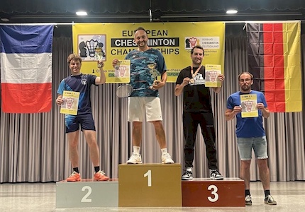 ![]() Siegerfoto mit Sören. Dabei wird zuerst eine Blitzpartie Schach mit 5 Minuten Bedenkzeit für jeden Spieler gespielt. Im Anschluss gibt es zwei Sätze im Badminton bis 11 Punkte und danach wird nochmals eine Schachpartie mit 5 Minuten Bedenkzeit gespielt. Die restliche Bedenkzeit des Gewinners im Schach wird dann in Punkte umgewandelt. Der Sieger ist derjenige mit der höheren Punktzahl. Für die Europameisterschaft in dieser Sportart konnte sich Sören Klemp vom 1. Burgstädter Schachklub 1914 qualifizieren. Am erfolgreichsten startete er in der Disziplin „Herren Einzel”, wo er in einem Feld aus 24 Teilnehmern den 4. Platz erreichte und so nur knapp am Podium vorbei schrammte. Erster Titelträger in dieser Disziplin wurde Schachgroßmeister Thal Abergel aus Frankreich, vor den beiden Deutschen Felix Nötzel und Joshua Heinzmann. Herzlichen Glückwunsch zu dieser Leistung von Sven Rotzoll und Harald Adam im Namen aller Vereinsmitglieder. |