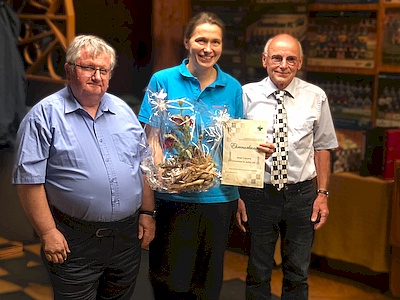 ![]() Anne Czäczine mit André Martin (Präsident SVS) und Volkmar Brand (Vorsitzender Chemnitzer SC Aufbau '95). Anne ist seit Kindesalter im Verein, mit ihm über 30 Jahre verbunden und groß geworden. Die Weitergabe ihrer großen schachlichen Erfahrungen und Erkenntnisse liegt ihr besonders am Herzen. Als Trainerin im Verein vermittelt sie jede Woche in unzähligen Stunden Kindern und Jugendlichen, die Geheimnisse des Schachs. Im Vorstand des Vereins arbeitet sie seit sieben Jahren als Jugendleiterin. Als Mannschaftsleiterin der Frauenmannschaft hat sie großen Anteil am diesjährigen Aufstieg in die 1.Bundesliga. Durch ihre sehr positive Ausstrahlung, kann sie sehr vielen Menschen die Schönheit und den Reiz des Schachspiels beibringen. Anne ist als aktive Schachspielerin bei vielen Turnieren unterwegs, als selbst Teilnehmende bzw. als Schiedsrichterin, Helferin und Betreuerin. Ihr aufopferungsvolles Ehrenamt erstreckt sich darüber hinaus auch auf die Ausgestaltung von Breitenschachveranstaltungen, wie Kinderfesten im Verein, Weihnachtsfeiern u.v.a. Die großen Erfolge im Kinder- und Jugendschach der letzten Jahre im Verein sind ein Verdienst einer sehr arrangierten und sehr gut arbeitenden Jugendleiterin. |