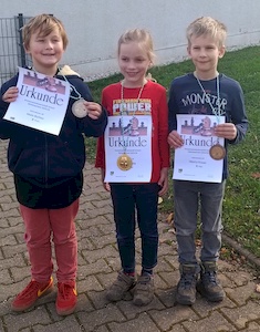 ![]() Mats, Corvin und Moritz. ![]() Lea-Sophie und Daniela. U8 Kreiseinzelmeister Corvin Pippig und Bronze Moritz KrauseIn dieser Altersklasse wird noch mit verkürzter Bedenkzeit und ohne Notationspflicht gespielt. So war dieses Rundenturnier der "Schachzwerge" bereits zur Mittagszeit entschieden. Corvin und Moritz aus der Trainingsgruppe von Lennert Drechsel und seiner Großmutter am Hort der Grund-schule Hartmannsdorf konnten dabei schon voll überzeugen und direkt auf Anhieb Edelmetall einsammeln. Mats Richter aus Frankenberg belegte dank besserer Wertung den Silberrang.U10m/w ohne eigene TeilnehmerIn dieser Altersklasse war unser Wanja leider wegen Krankheit verhindert, sodass wir selbst keinen Teilnehmer stellen konnten. Es siegte ohne Punktverlust Leon Langklotz (Geringswalde) vor Benno Herrmann (Frankenberg) und Damian Schneider (Niederwiesa). Bei den Mädchen wurde Yuna Weck (Frankenberg) Titelträgerin.U12w/U14w Vizekreiseinzelmeisterin Lea-Sophie WagnerDie verbliebenen vier Mädchen spielten in einem gemeinsamen, aber getrennt gewerteten Turnier. Lea-Sophie aus Lennerts Trainingsgruppe konnte bei ihrem ersten Einzelturnier in der jüngeren Gruppe schon Silber erringen. Dabei setzte sie Schritt für Schritt die Ratschläge ihres kiebitzenden Trainers in den jeweils folgenden Runden präzise um. Titelträgerin wurde Daniela Stankovic vom gastgebenden Verein. In der älteren Altersklasse gingen Gold und Silber an Leia Böhme und Drillingsschwester Lisa aus Hainichen.U12 Dritter Lennert DrechselDiese Altersklasse musste mit 10 Teilnehmern im Schweizer System ausgetragen werden. Für AG-Leiter Lennert reichte es zum Schluss verdient zu Bronze. Gold und Silber gingen an Phu Anh Ngo Tran und Levi Birnbaum (beide Frankenberg).U14/U16 Kreiseinzelmeister Anton RauschDie Altersklasse U14 ist bei uns leider vakant. Den Titel sicherte sich Matthias Müller aus Geringswalde. Drillingsbruder Yanick verbuchte eine weitere Silbermedaille für Familie Böhme. Bronze ging an Vince Tittel nach Eppendorf. Anton Rausch konnte sich in der älteren Klasse die Goldmedaille und seinen ersten Kreiseinzelmeistertitel sichern.U18 Turnier läuft nochDiese starke Fünfergruppe musste wegen Zeitproblemen nach der vierten Runde vertagt werden. Die Entscheidung fällt nun erst in der letzten Runde in zwei Wochen. Für Lukas ist somit noch alles drin.Rangliste: Stand nach der 4. Runde