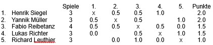 ![]() Topspiel Ruslan Nuriyev 0:1 Markus Gößler. Damit aber längst nicht genug: weil auch die bis dato ersten Verfolger Edwin Fischer und Matthias Hörr über Martin Kapp bzw. Birger Watzke siegreich waren, liegt plötzlich ein ganzes Quartett von Akteuren mit jeweils 5,5 Punkten an der Spitze. Als Fünfter kann vielleicht auch Niklas Preißler weiter mitmischen, der ebenfalls gewann und als Einziger mit 5,0 Zählern noch guten Kontakt nach oben hat. Bemerkenswert des Weiteren der Sieg von Joshua Li, der in der längsten Partie des Tages den vierfachen Stadtmeister Stanislav Azimov niederrang. Etwas kurios: gleich 2 Partien endeten diesmal insbesondere für die Betroffenen - leider - völlig unvermittelt, aber eben korrekt, durch Zeitüberschreitung (ZÜ). Am prominentesten erwischte es sicherlich Birger Watzke, der sich zuvor mit Hörr einen starken Fight geliefert hatte. Aber auch Peter Höhne staunte ebenso wie sein Kontrahent Rainer Günnel nicht schlecht, als die Partie abrupt zu Ende war. In der Vorschlussrunde am 10.04.25 bleiben die ersten Vier unter sich und treten in den Begegnungen Nuriyev - Fischer und Gößler - Hörr direkt gegeneinander an, während es Preißler mit Martin Kapp, dem Ersten des 4,5-Punkte-Sextetts, zu tun bekommt. |
