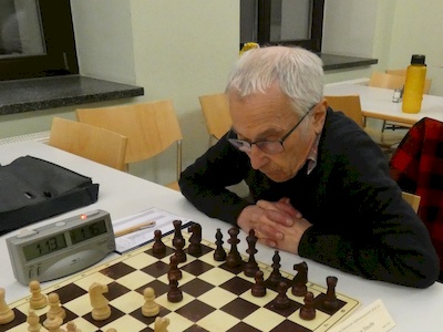 ![]() Nimmt seit 1993 zum 31. Mal (!) am Turnier teil: Rekordteilnehmer Rainer Staudte. Angefangen von Titelverteidiger Markus Gößler bis hin zum Top-8-Gesetzten Wolfgang Beyer hielten sich sämtliche Mitfavoriten weiter schadlos und führen das Feld mit 2,0 Punkten gemeinsam an. Aufgrund der besseren Feinwertung wurde die Reichenbrander „Eiche” Martin Kapp als erster alleiniger Spitzenreiter dieses Turnieres ermittelt. In der 3. Runde treffen sie nun alle acht in vier Duellen direkt aufeinander, was u.a. am Spitzenbrett bereits die Ex-Stadtmeister-Paarung Markus Gößler - Stanislav Azimov bereithält. Just das komplette 1,5-Punkte-Verfolgertrio, bestehend aus Rolf Junghans, Bernd Wollmann und Frank Schröder, setzt zur nächsten Runde aus, womit es mit absehbar weiteren je 0,5 (kampflosen) Punkten zunächst sicher im Vorderfeld verbleiben wird. Der gewiss nicht unwesentlichen Vollständigkeit halber sei noch Sebastian Freiberg erwähnt, der mit seiner nachträglichen Anmeldung das Feld abermals, auf nunmehr 41 Teilnehmer anwachsen ließ. |
