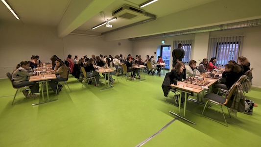 Der Spielort, die Jugendherberge „eins”, ist ein historisches Gebäude aus dem Jahre 1908, wurde zwischenzeitlich als Transformatorenwerk und später als Verwaltungsgebäude genutzt. Nach langem Leerstand wurde 2012 nach umfangreicher Sanierung das Haus an den Jugendherbergsverband übergeben. Seine Geschichte ist dem Haus anzusehen, da bei dieser Sanierung darauf geachtet wurde, dass sich die historische Gestalt des Gebäudes mit modernen Gestaltungselementen ergänzt. Somit entpuppt sich im Spielsaal im Keller ein ganz besonderer Charm. Auch wenn wir an den „Weltrekord” aus Rotenburg nicht heranreichen konnten, so verlief der Aufbau der DGT Bretter dank der Erfahrung des DSJ-Teams aus Harald, Ratho und Sandra sowie der Unterstützung der zahlreichen lokalen Helfer recht zügig. Mit dem Zeitstempel „leider habe ich vergessen auf die Uhr zu schauen” waren die beiden Spielsäle vorbereitet und bereit für den pünktlichen Start der Meisterschaft am nächsten Morgen. Am neuen Tag füllten sich die geschichtsträchtigen Hallen mit Leben, Spielerinnen und Betreuende strömten zu den Runden. In der ersten Runde zeigte sich bereits, dass Schach auf dem Brett und nicht anhand von DWZ-Zahlen entschieden wird. Somit stachen das 2,5:1,5 von SchVgg Blankenese gegen SAV Torgelow-Drögeheide an Tisch 6 heraus. Trotz im Durchschnittlich fast 200 Punkte geringeren Wertzahlen konnte Blankenese einen Erfolg verbuchen. Auch in den Partien SF Roding gegen SG Königskinder Hohentübingen, SC Garching gegen FC Bayern München sowie SG Porz gegen SV Stuttgart-Wolfbusch konnte sich der Favorit nicht durchsetzen und die Wettkämpfe endeten 2:2. In der zweiten Runde schaffte es der Hamburger SK in Duell gegen die Schachzwerge aus Magdeburg standzuhalten. Als letzte Partie im oberen Spielsaal setzte sich Kristina-Maria Abram gegen ihre Kontrahentin durch und sicherte somit dem HSK das 2:2. Unter voller Konzentration blieben die Saftflaschen bisher nahezu unangetastet, die Vorräte sind voll, der Durst jedoch klein. Aber eins geht immer gut, das ist Wasser. Wir freuen uns auf weitere spannende Runden, morgen früh treffen die bisher als einzigen ungeschlagenen Teams SV Königsjäger Süd-West und USG Chemnitz aufeinander. Wir sind gespannt.